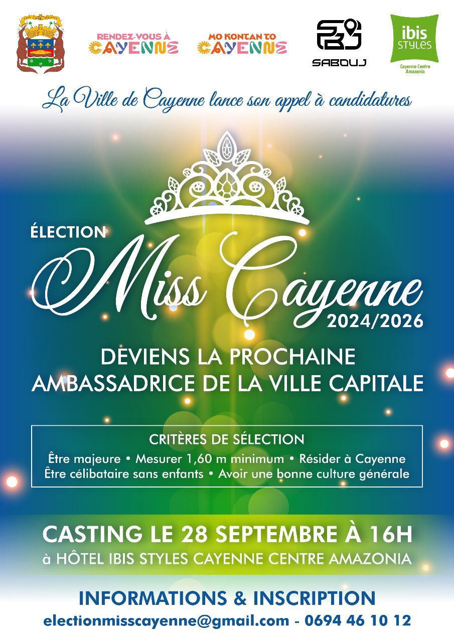 Le concours Miss Cayenne 2024/26 vous donne l’opportunitĂ© de rayonner et de reprĂ©senter la ville.