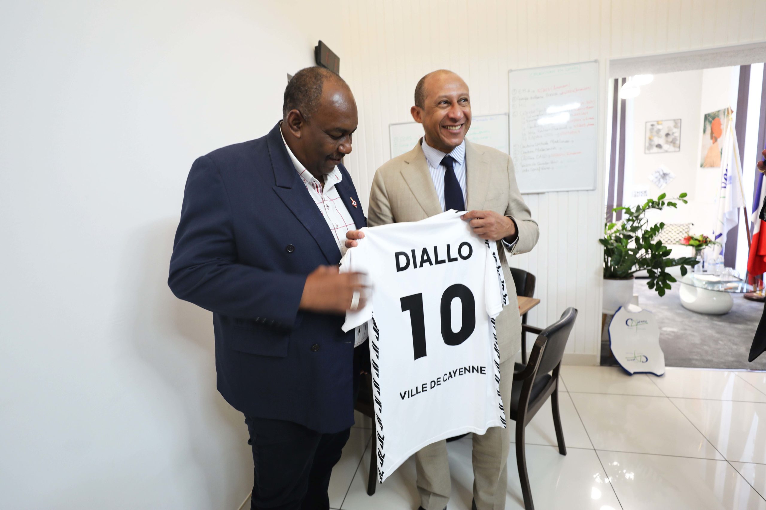 professionnalisation des cadres et le déblocage d’une enveloppe conséquente par le biais du Fond d’aide au football amateur ».M. Christian FAUBERT au nom de Sandra TROCHIMARA, Maire de la ville de Cayenne et de son conseil municipal a remis la médaille de la ville à Philippe DIALLO et symboliquement, un équipement sportif aux couleurs de la ville, ainsi qu’un maillot au nom du Président, confectionné par un industriel guyanais, Flexible.