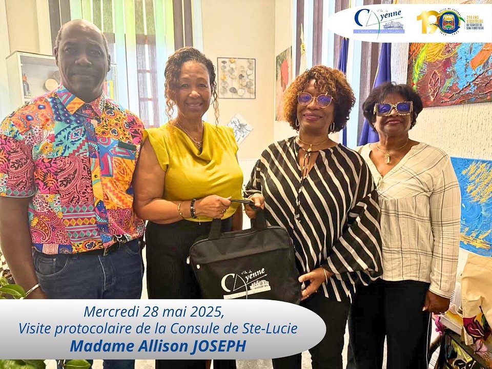 Dans la poursuite des démarches de facilitation des échanges entre la Guyane et Sainte-Lucie, Madame Sandra TROCHIMARA, Maire de la Ville de Cayenne, a rencontré, mercredi 28 mai 2025, Madame Allison JOSEPH, Consule de Sainte-Lucie, en présence de Madame Hélène PAUL, 4e Maire Adjointe, déléguée à l’Attractivité du Territoire et au Développement du centre-ville, ainsi que Présidente de l’Office de Tourisme du Centre Littoral (OTCL), et de Monsieur Jean-Marc AMBROISE, 3e Maire Adjoint, délégué à la Politique de la Ville.Ils ont également pris part aux échanges, afin de poursuivre l’amélioration des démarches administratives pour la régularisation et l’intégration des ressortissants, le développement du secteur touristique, et les projets d’échanges culturels et linguistiques autour de jumelages entre villes capitales (Cayenne – Castries).