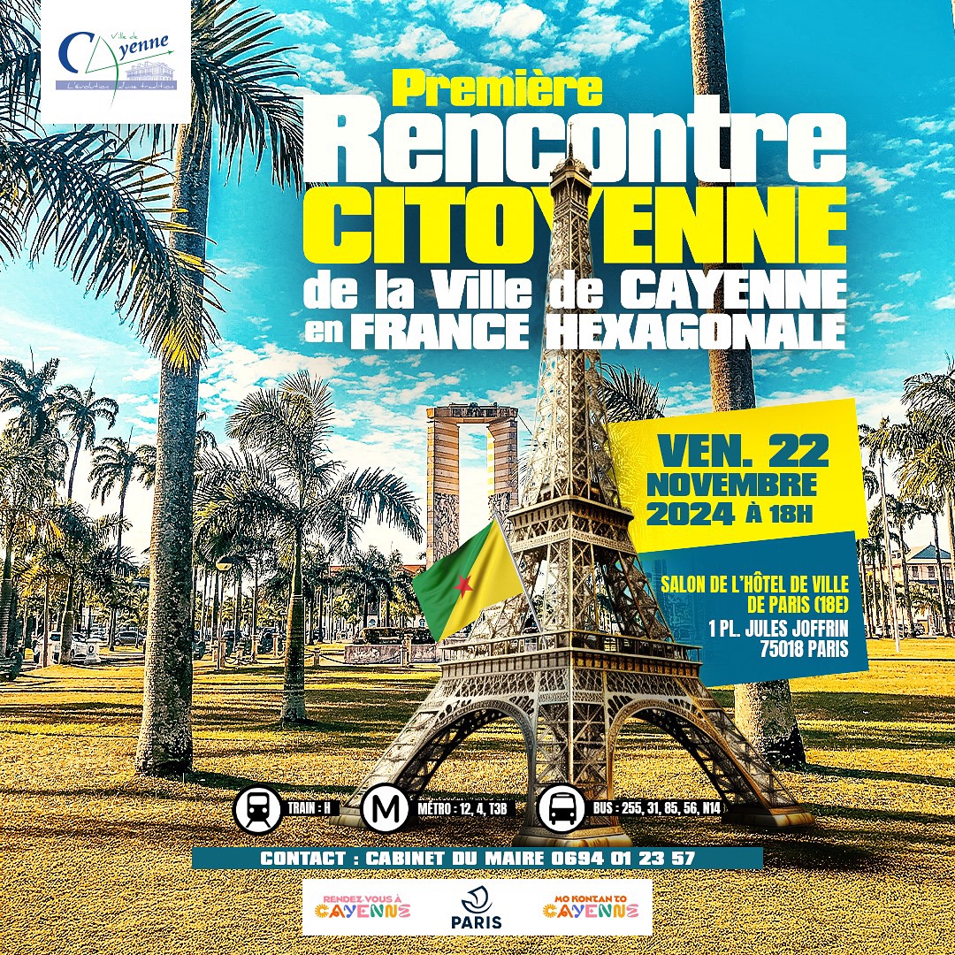 La Ville de Cayenne a le plaisir de vous convier à sa première Rencontre Citoyenne en France hexagonale ! Un rendez-vous inédit sous le signe du dialogue, du partage et de la mise en valeur de notre ville capitale.
