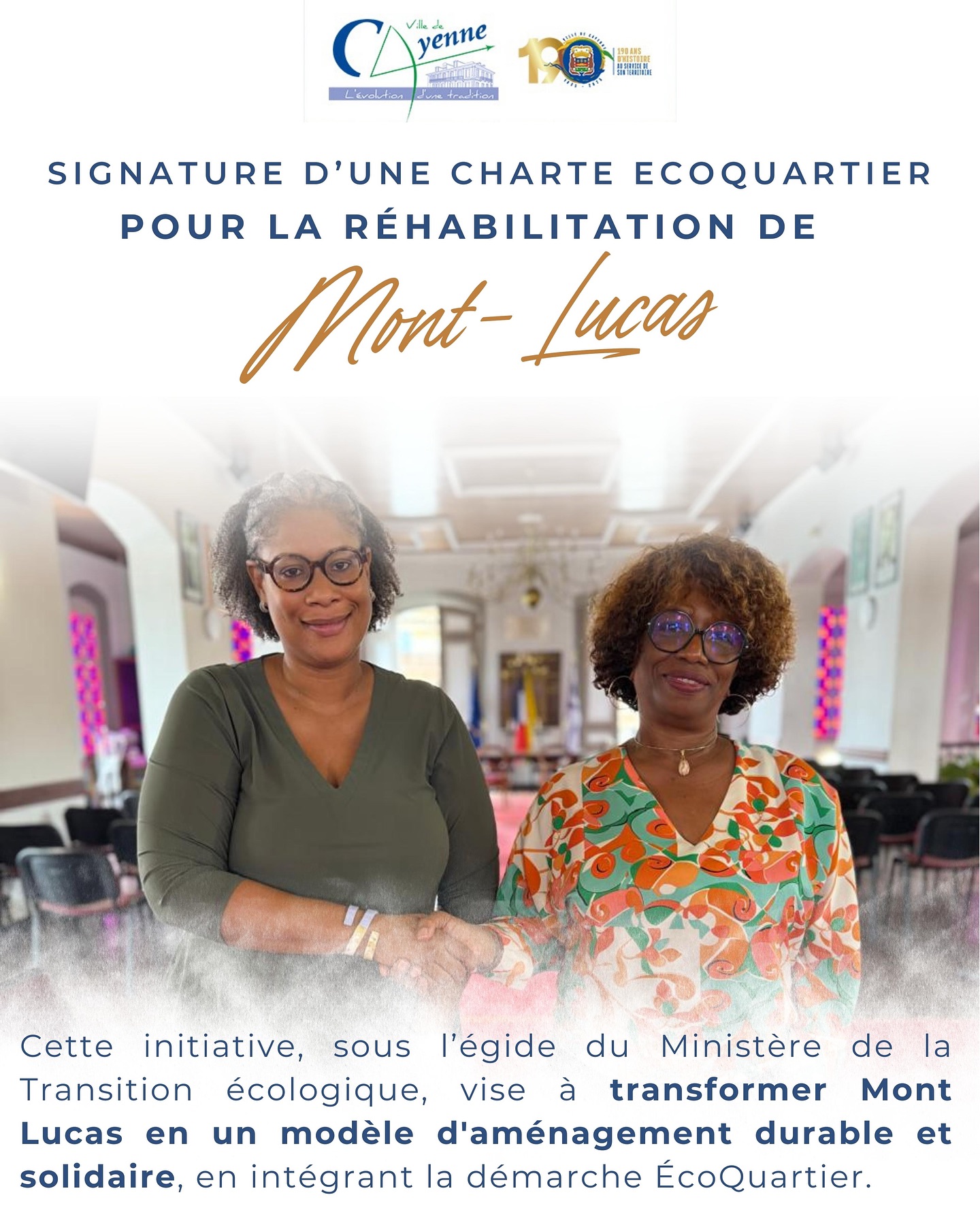 La signature de la Convention de Mont Lucas entre Mesdames Sandra TROCHIMARA, Maire de Cayenne et Crystelle DIB-PITROLLE, Directrice générale de la SIGUY et de la SIMKO, place sur orbite un nouvel exemple inspirant de sobriété, d’inclusion, de résilience et de création de valeur pour Cayenne et au-delà.