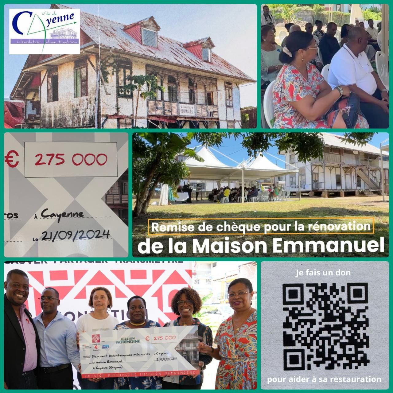 En présence de Madame Sandra TROCHIMARA, Maire de la ville de Cayenne, accompagnée de Christian FAUBERT, son premier adjoint, l’Association Eglise Evangélique de la Guyane, porteuse du projet , emmenée par Sandra SOPHIE et Marie Hélène JACOBE, respectivement présidente et coordinatrice, ont reçu un chèque de 275 000, de la part de la Fondation du Patrimoine et de La française des jeux. Les deux partenaires s’unissent pour acter la démarche de rénovation de ces lieux habités par une structure représentant un pan de notre patrimoine matériel et immatériel. Un Patrimoine historique de Cayenne, un patrimoine incontestable de la Guyane, et désormais, aujourd’hui, solennellement, un héritage reconnu de part toute la France.