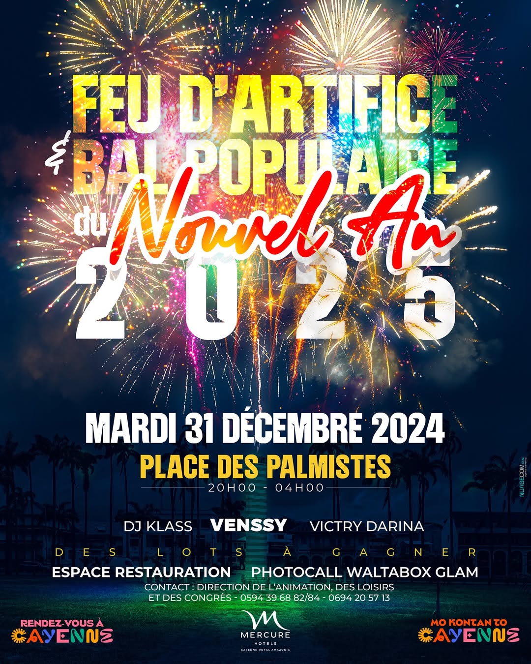 Rendez-vous à Cayenne, le 31 décembre pour le feu d’artifice et le bal populaire de fin d’année sur la Place des Palmistes de 20h à 04h.
